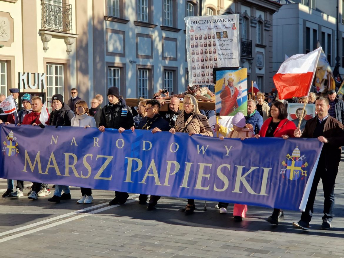 Małgorzata Żaryn, jedna z organizatorek Marszu, wspomniała, że pierwszy Narodowy Marsz Papieski zgromadził ok. 50 tys. osób i wyraziła radość, że dziś też jest dużo uczestników tego wydarzenia. Podkreśliła, że męczeńska śmierć ks. Jerzego 40 lat temu jest dziś dla nas ogromnym symbolem oddania życia za Ojczyznę i za bliźniego. – Ale idziemy również w duchu słów Jana Pawła II, którego tutaj słyszeliśmy wielokrotnie. Ojciec Święty przywrócił nam, Polakom, podmiotowość, oddał nam wolność zabraną w czasach komunistycznych oraz naszą tożsamość i dziedzictwo – mówiła, przypominając, że marsz idzie też po to, aby upomnieć się o wartości chrześcijańskie. – Idziemy za trzema patronami, bo towarzyszy nam jeszcze Prymas Tysiąclecia. Oni wszyscy mieli bardzo głęboko w swoich sercach nasz naród i człowieka jako podmiot – dodawała.